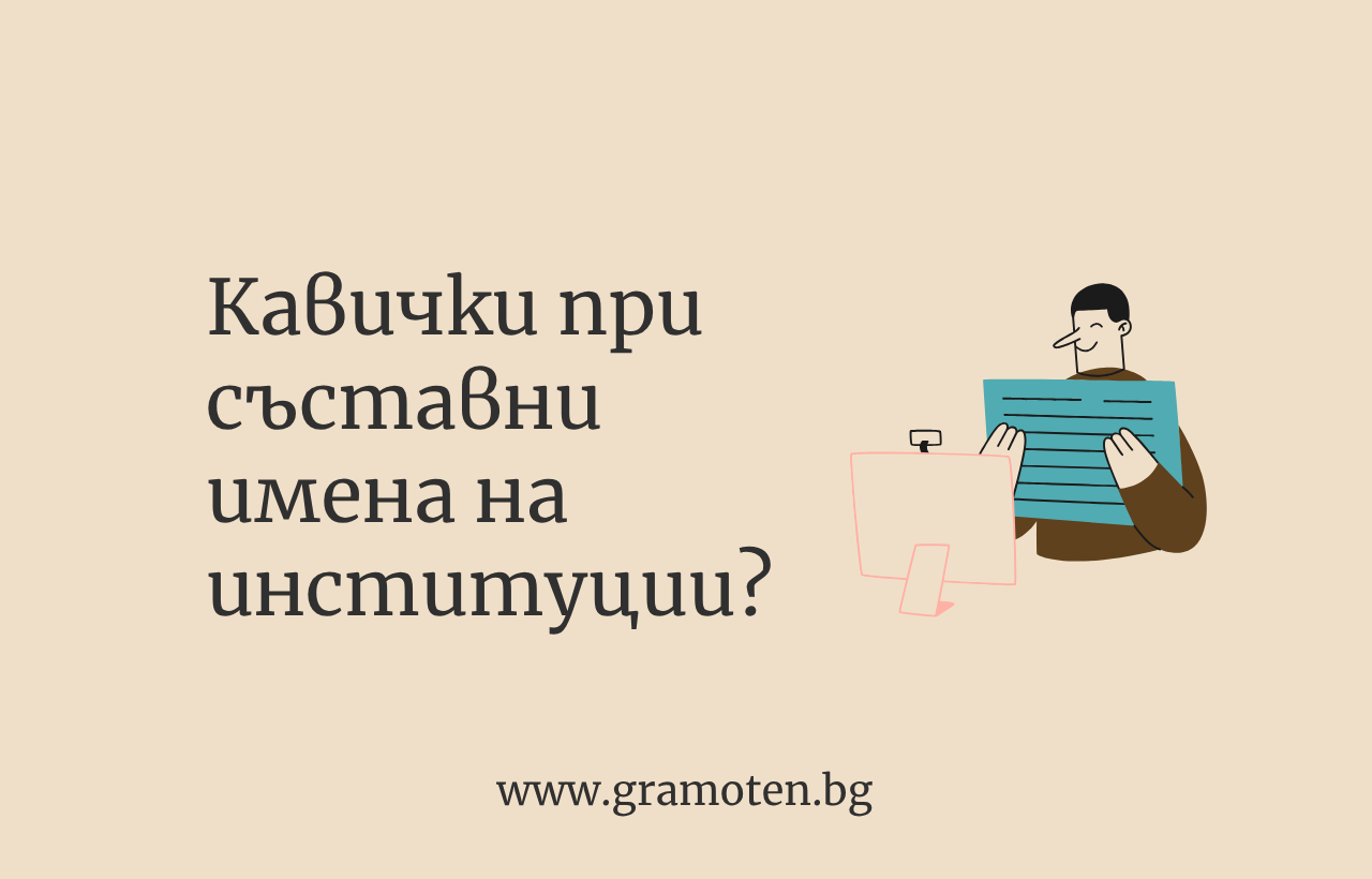 Затруднението е породено основно от два въпроса. Първият от тях е дали имената на институциите по принцип трябва да се слагат в кавички, а вторият – дали името на институцията е съставно (състоящо се от две или повече думи). А какво става, ако името на институцията е съставно собствено име, което съдържа друго собствено име? Къде поставяме кавичките тогава и изобщо трябва ли да се пишат кавички?