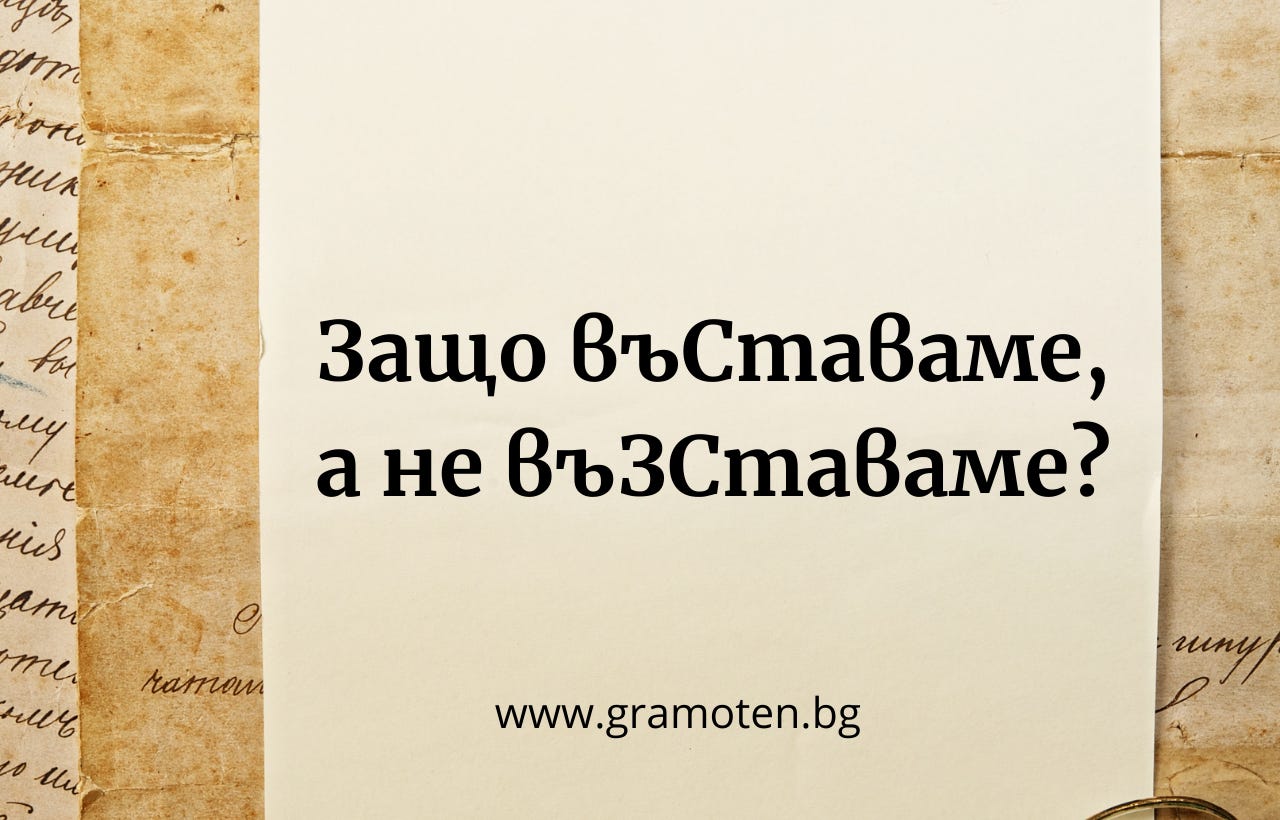 Справка с Българския етимологичен речник (1971, Т. 1, с. 215) показва, че правописът на думите въставам, въставане, въстана, въстание, въстаник, въстанически и въстаничка се свързва със старобългарските думи βϊρςΰςθ и βϊρςΰνϊε, които, както се вижда, се пишат без з (първите седем тома на Речника може да бъдат намерени в електронен вид на страницата на Института за български език „Проф. Любомир Андрейчин“ – http://ibl.bas.bg/ber/). Така по традиция тези думи остават в езика ни, изписани по този начин. Именно поради тази причина въставаме, а не възставаме.