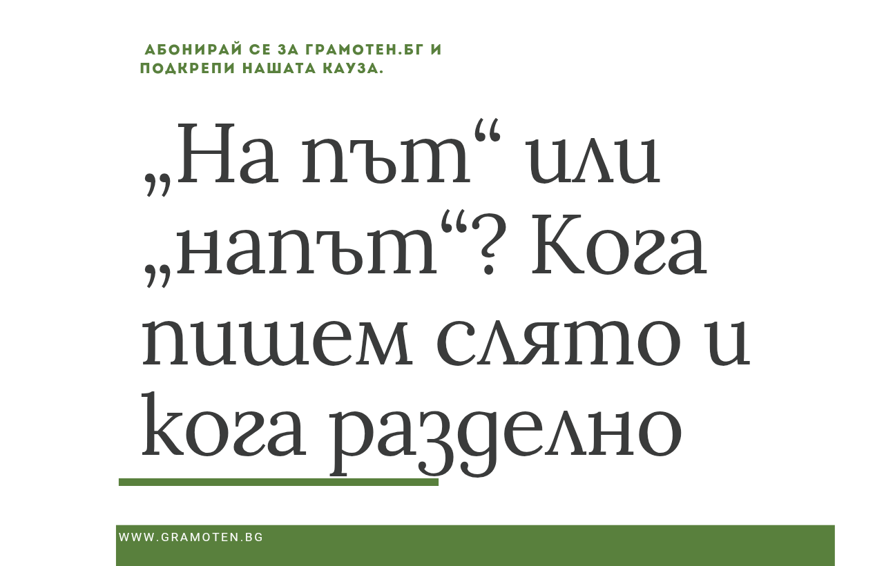 Съществува ли обаче в българския език дума напът? Справката с Официалния правописен речник на българския език показва, че такава дума няма, т.е. в посочените по-горе примери е допусната правописна грешка.